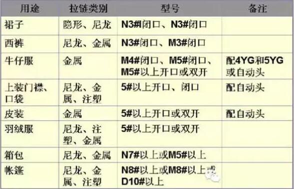 不同用途的拉鏈型號選擇表