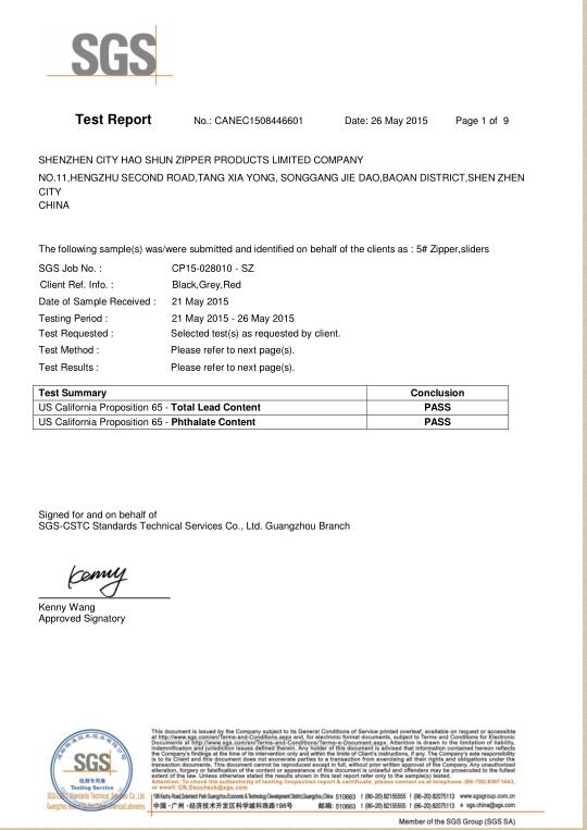 深圳豪順拉鏈《加州65鉛和鄰苯測試報告》第1頁